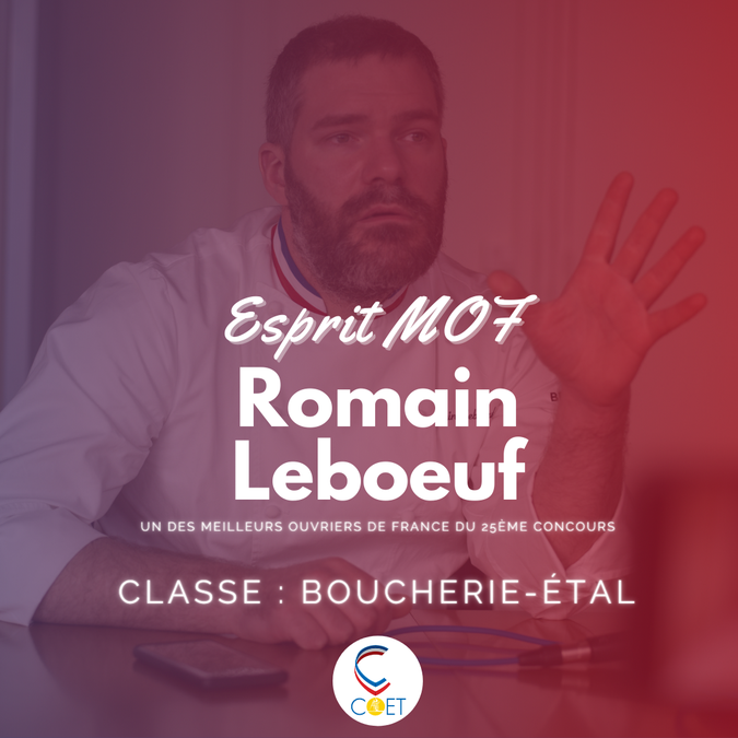 Romain Leboeuf, UMOF dans la classe boucherie‑étal, nous partage son parcours professionnel. C’est avec passion qu’il exerce son métier qui requiert technique, maîtrise et précision. Aujourd’hui, il transmet son savoir‑faire à des apprentis qui ont soif d’apprendre auprès d’un des meilleurs ouvriers de France.