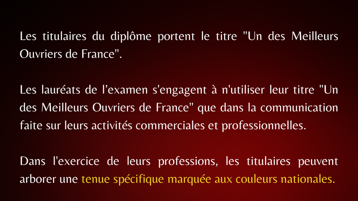 Les lauréats de l’examen, s'engagent à n'utiliser leur titre "Un des Meilleurs Ouvriers de France" que dans la communication faite sur leurs activités commerciales et professionnelles.