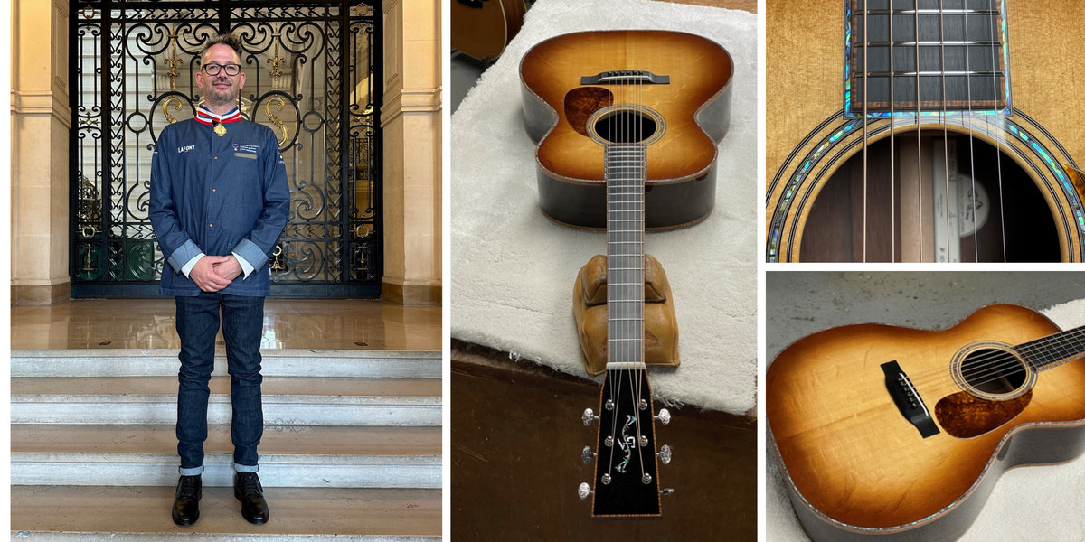 J’ai choisi de fabriquer une guitare acoustique folk. J’y ai incorporé mon expérience de restaurateur, ainsi que des matériaux plus modernes comme le carbone.